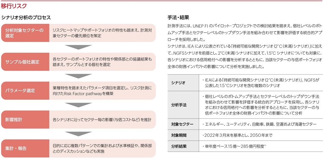 ・カーボンニュートラルに向けた計画や取り組みが外部ステークホルダーから不適切または不十分と評価されることによる評判の悪化 ・環境への配慮が不十分な取引先との関係継続や、自社の移行が遅延することによるMUFGの評判悪化、雇用への影響 |