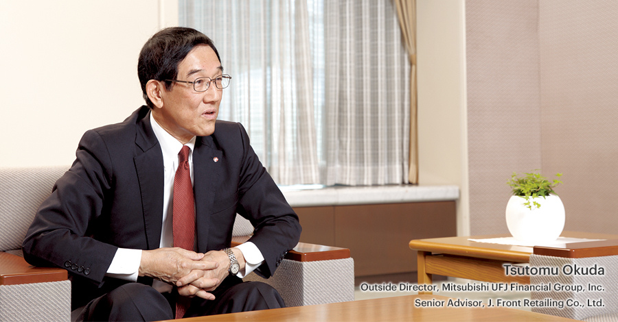 After joining The Daimaru, Inc. in 1964, Mr. Okuda assumed the office of president at Daimaru in 1997 and was appointed chairman & CEO in 2003. Having spearheaded the merger of this reknowned department store group with its rival Matsuzakaya, he took the office of president & CEO at J. Front Retailing Co., Ltd., the merged entity, in 2007, becoming chairman & CEO of that firm in 2010. Since 2014, MR. Okuda has served as a senior advisor of J. Front Retailing. In the same year, he was appointed as an outside director at MUFG (current position).