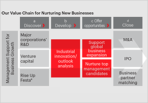 Looking to realize a next-generation business, we are striving to create a value chain encompassing all aspects of the business development process, including discovering up-and-coming businesses, devising optimal financial solutions to assist commercialization, offering business growth opportunities, and closing IPO and M&A deals.