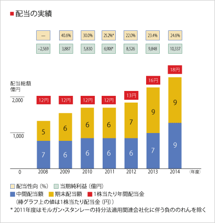 MUFGは、株主の皆さまへの利益還元を重要な経営課題と位置付け、利益成長を通じた1株当たり配当金の安定的、持続的な増加をめざすことを基本方針としています。