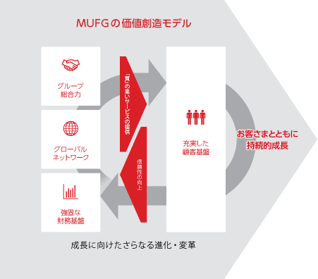 経営ビジョンは、MUFGグループが経営活動を遂行するにあたっての最も基本的な姿勢を示した価値観であり、全ての活動の指針とするものです。
