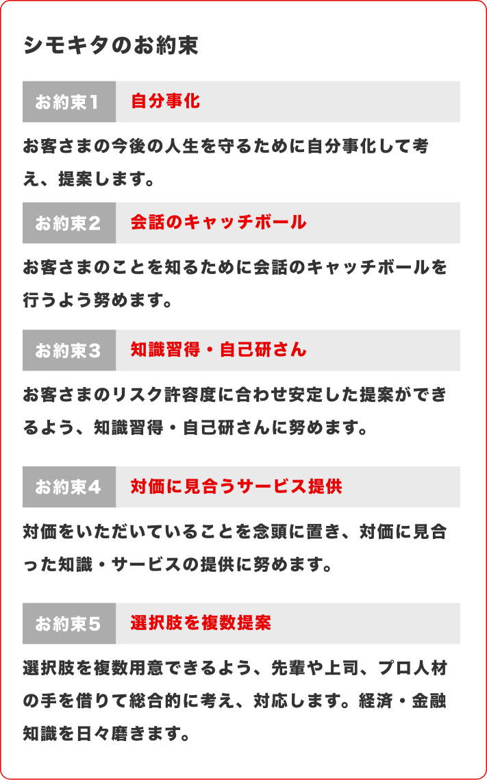 小嶋さんがお客さまにNISAのご案内をした際にいただいた言葉です。お客さまにとって「シモキタがMUFGとの取引の入り口」であることをメンバー一人ひとりが認識し行動した結果、お客さまからの感謝の言葉も多くいただくようになりました。人生の要所で相談したいと思ってもらえる存在になるため、「シモキタのお約束」はこれからも下北沢支店の指針であり続けます。下北沢支店のメンバーは、今日もお約束を胸に、お客さま一人ひとりに向き合っています。